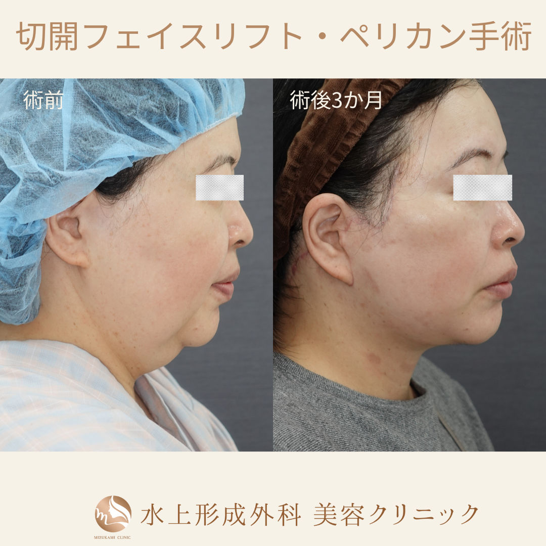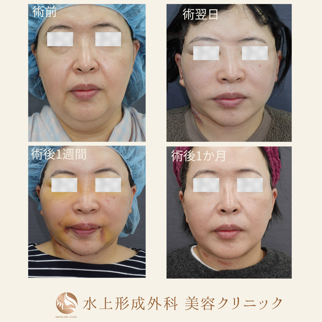| 合併症 | 出血、血腫、腫れ、痛み、感染、左右差、たるみの再発、手術部位の知覚麻痺、顔面神経麻痺、傷あとの目立ち、皮膚の凹凸、深部静脈血栓症 |